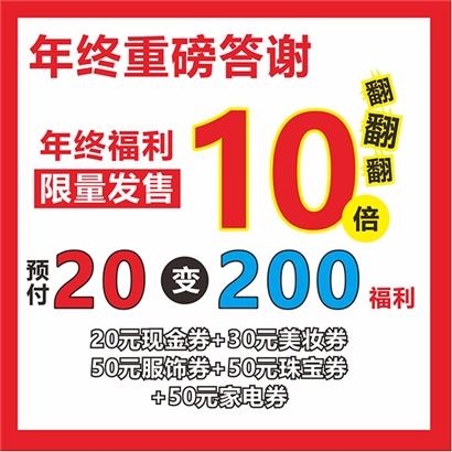 年终感恩答谢20元翻倍200元券包,翻十倍重磅回馈。