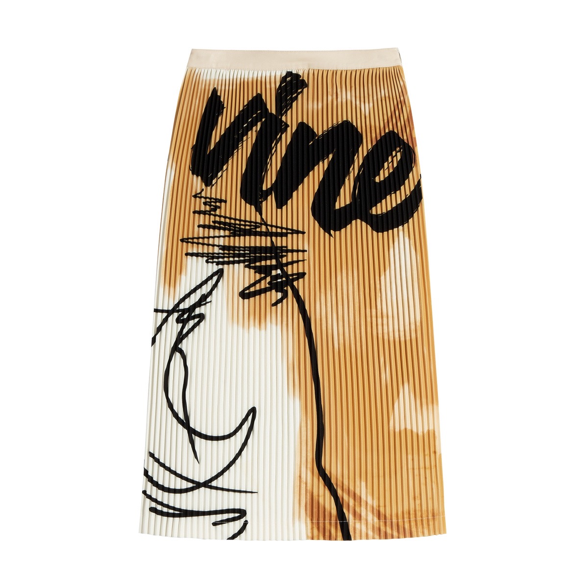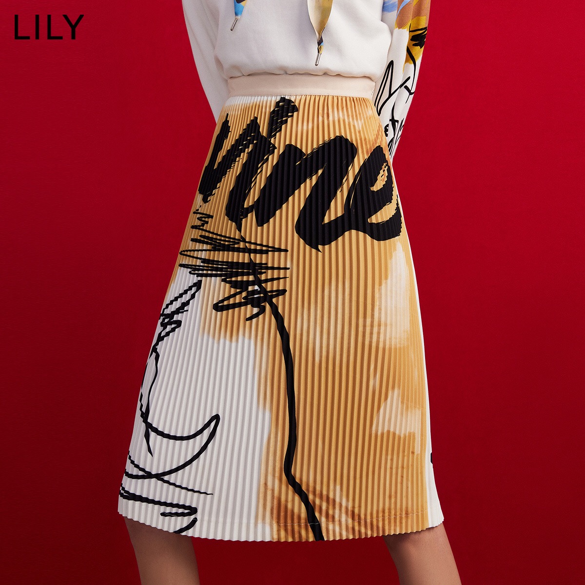 LILY春季新款艺术感撞色涂鸦牛牛百褶半身裙