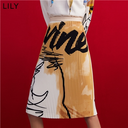 >>LILY春季新款艺术感撞色涂鸦牛牛百褶半身裙