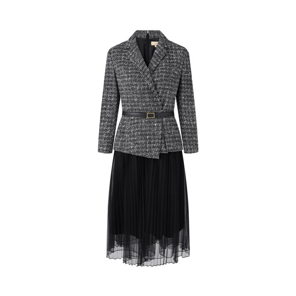 腰部叠片装饰;拼接百褶网纱裙;可拆卸腰带;大气西装领结合X型收腰廓形,简洁利 落,凸显干练职业气场,拼接梦幻百褶网纱,为单品融入优雅女人味,整体风格刚柔并 济,将新时代女性的飒美气质淋漓展现。