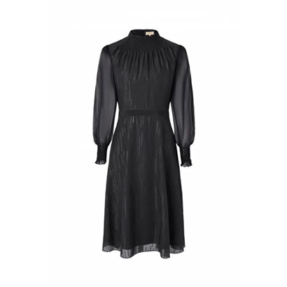 领部及袖口打缆;半透视;日常可穿的轻礼服款式,打破日常着装与小礼服的边界,黑 色亮丝雪纺,低调璀璨,华美却不张扬,领部及袖口细腻打缆设计,恰到好处地散发精致 魅力,实用易穿,适宜生活中每个富有仪式感的欢欣时刻。