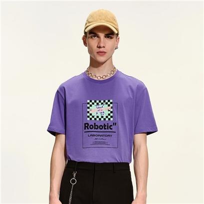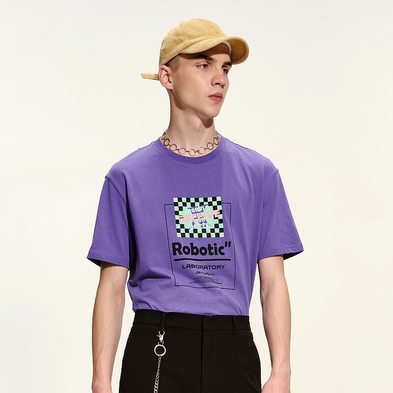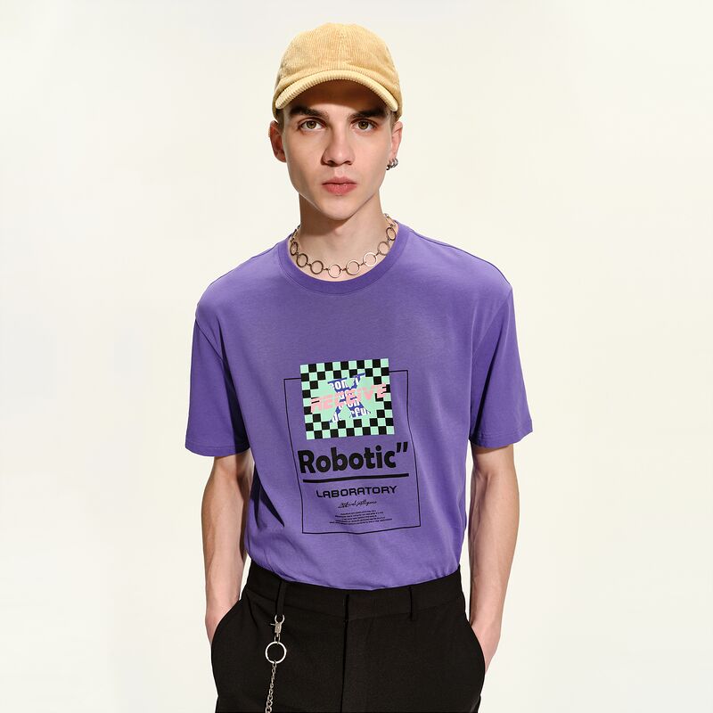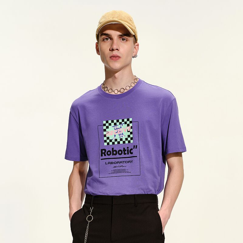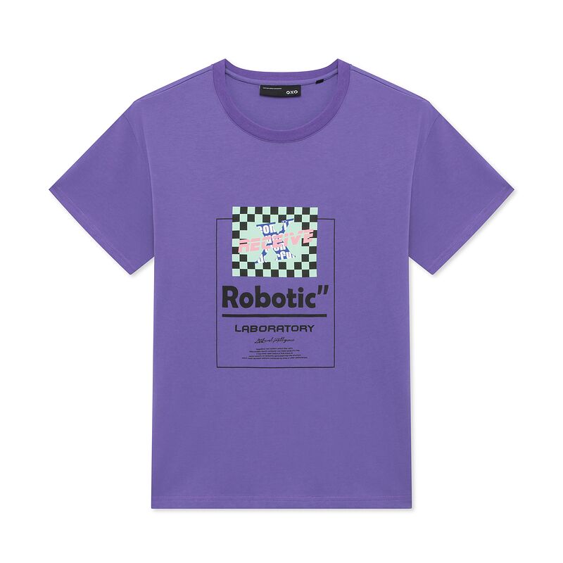 GXG男装2021年春季商城同款紫色圆领印花短袖T恤男士潮