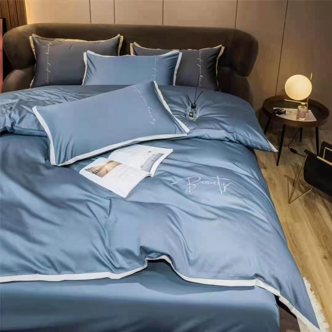 长绒棉四件套 高品质的棉花打造高品质的睡眠体验,60支长绒棉兼具奢华与实用。缎纹工艺最大程度突显长绒棉丝般光泽特性。 被套枕套以主色搭配配色飞边,活泼灵动,兼以精致字母刺绣,是设计师的低调小心机,也是卧室稳重不沉闷的好选择。