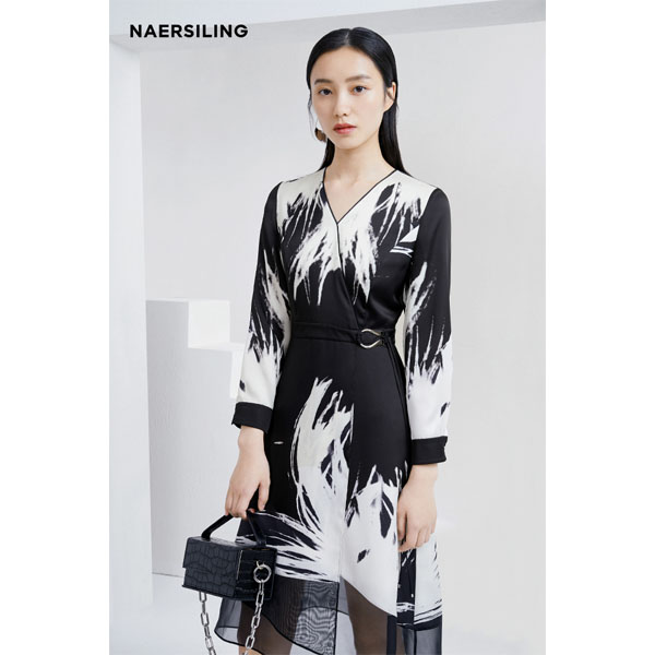 抽象笔触印花连衣裙,灵感源自包豪斯艺术的现代艺术画作,彰显了娜尔思.灵独具 一格的自信魅力;裙摆处采用通透欧根纱进行异材质拼接设计,增添了服装的结构性和层 次感,同时又打破沉闷,营造朦胧美;采用进口定纺FFY特种纤维织造,使得产品细腻而又独特光感,柔软又不失骨感,亲肤而又有质感,非常的好搭理;适合和朋友聚会穿着,彰显您时尚,大气的一面。吊牌价4990