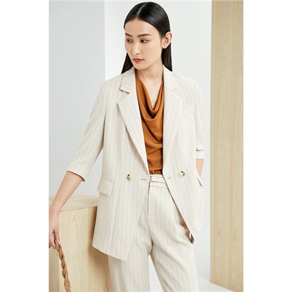原米色套装介乎于驼色和白色之间的一种都市色彩,它具有驼色的优雅大气,又具有 白色的纯净浪漫,是春夏必不可少的百搭色;西装外套采用七分袖的设计简约大方,区别 与传统袖长,在夏季穿着更加凉爽;面料采用轻爽仿麻料,透气性和吸汗性能优越,穿着 轻松舒适的同时质感高级;整套搭配适合您时尚职场穿着,彰显您摩登,干练的一面。