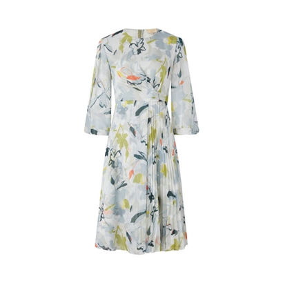 腰部立裁捏褶;裙摆百褶拼接;半透视袖;“晨雾花影”印花将自然设计抽象为艺术 创作,运用缤纷色彩描绘春夏林间光景,选用轻薄飘逸的真丝面料,百褶裙摆灵动生姿, 旋转轻舞,天真烂漫,散发自然诗意。