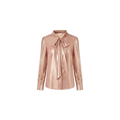 暗门襟;小泡泡袖;系带领;金属光泽面料;面料带有独特金属光泽,光线下呈现波 光粼粼的流动视觉效果,复古摩登,突破传统衬衫面料的思维局限,时髦有腔调,为通勤 着装带来摩登新意。