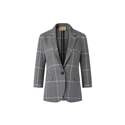 欧洲进口雾蓝色格纹面料;一粒扣;3/4袖长;欧洲进口雾蓝色格纹面料,温婉雅致, 兼具复古韵味与都市魅力; 经典收腰版型搭配3/4袖长,精致干练,塑造完美身材比例; 一粒扣设计,简洁干练,简雅有型。