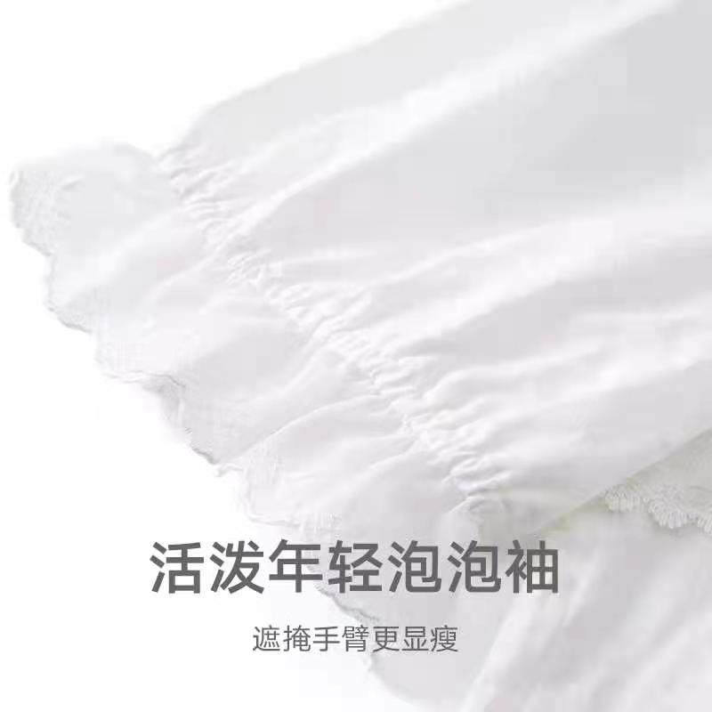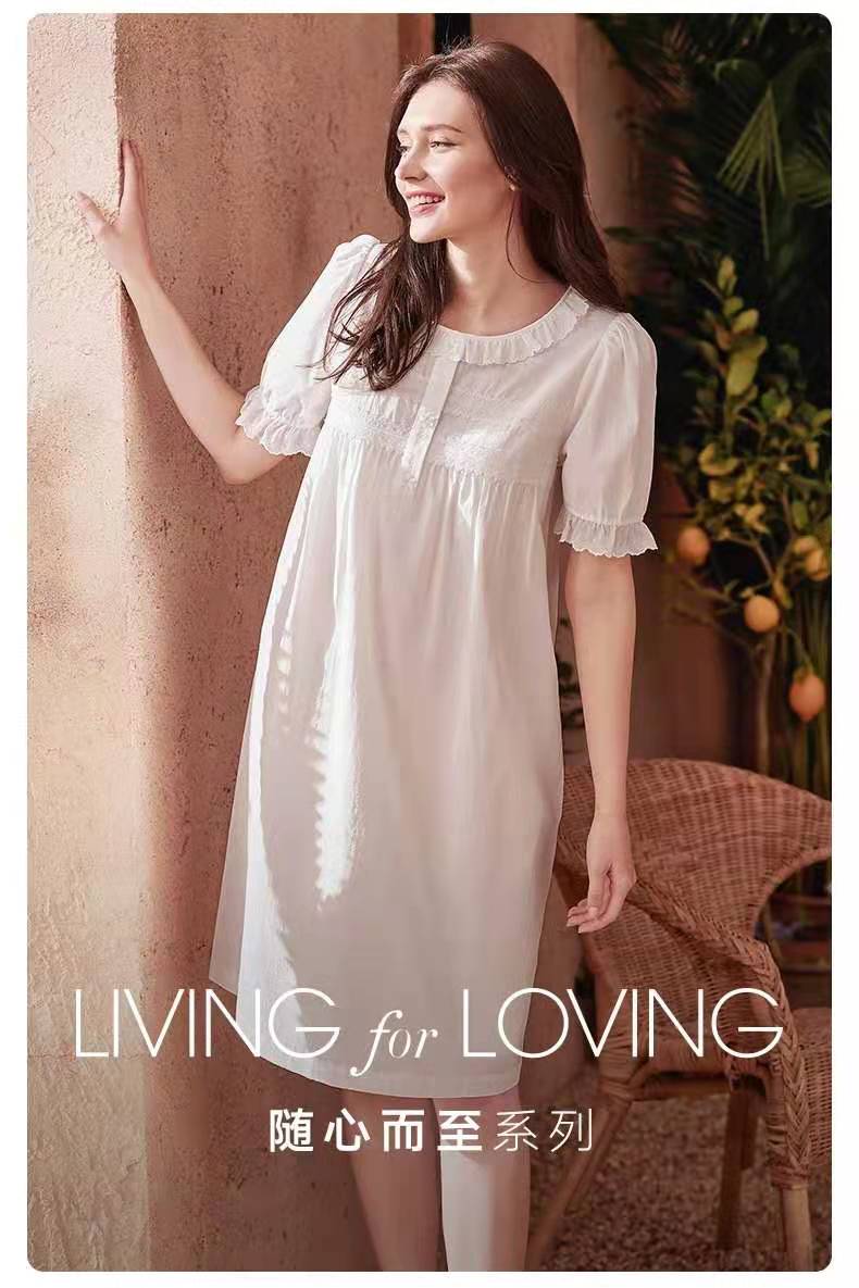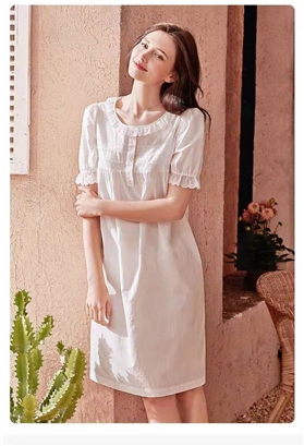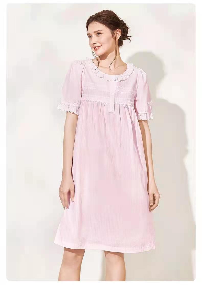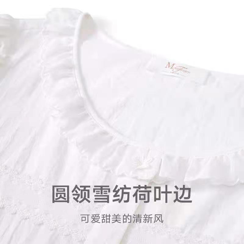曼妮芬细密简约棉舒适透气中裙甜美 荷叶领泡泡短袖裙装家居服