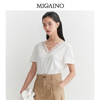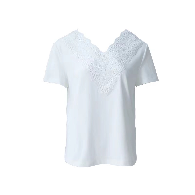 >>曼娅奴2021简约白色镂空V领T恤