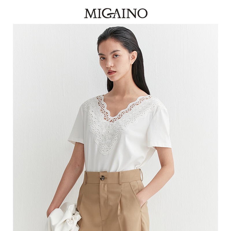 曼娅奴2021简约白色镂空V领T恤