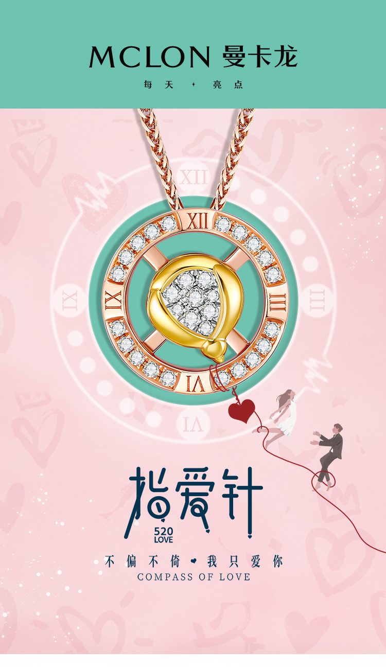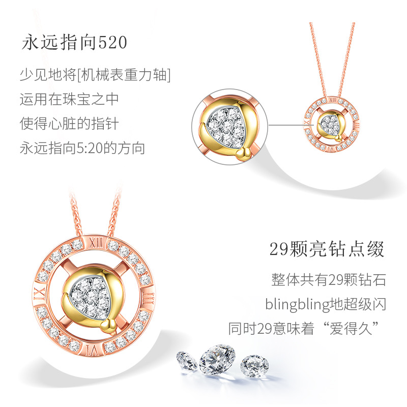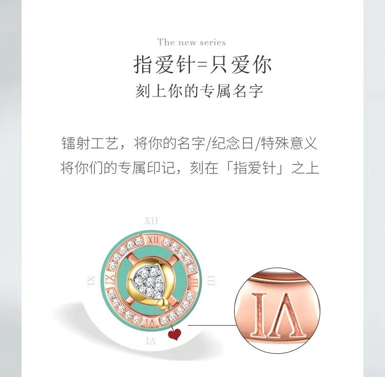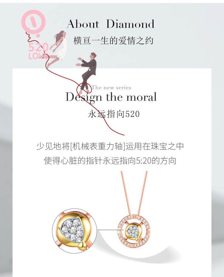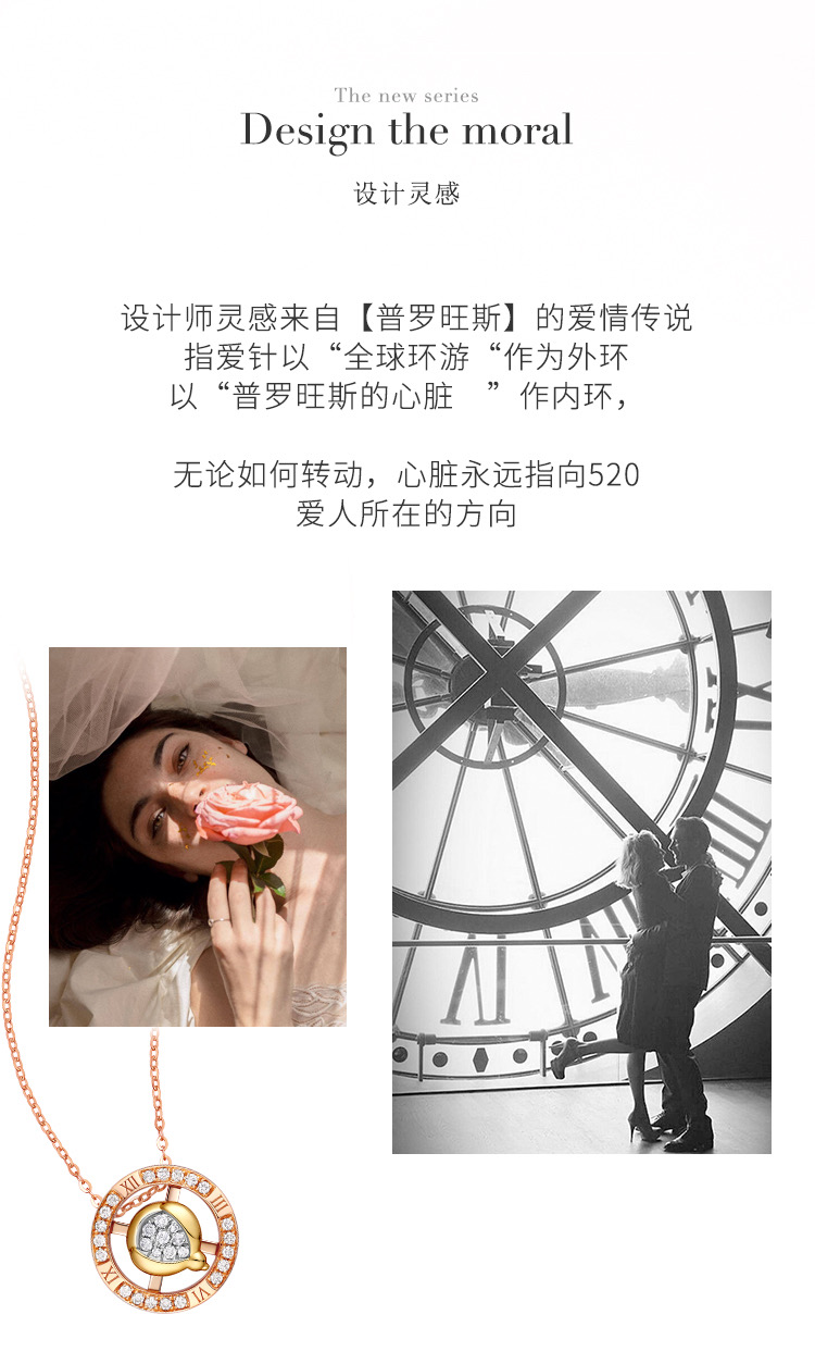 设计灵感来自(普罗旺斯)的爱情传说 指爱针以“全球环游”作为外环 以“普罗旺斯的心脏”作内环, 无论如何转动,心脏永远指向520 爱人所在方向 29颗钻石代表爱的的长久, 指针指向5:20,代表不偏不倚,我只爱你, 指针转动,寓意任时光流转,愿初心不变