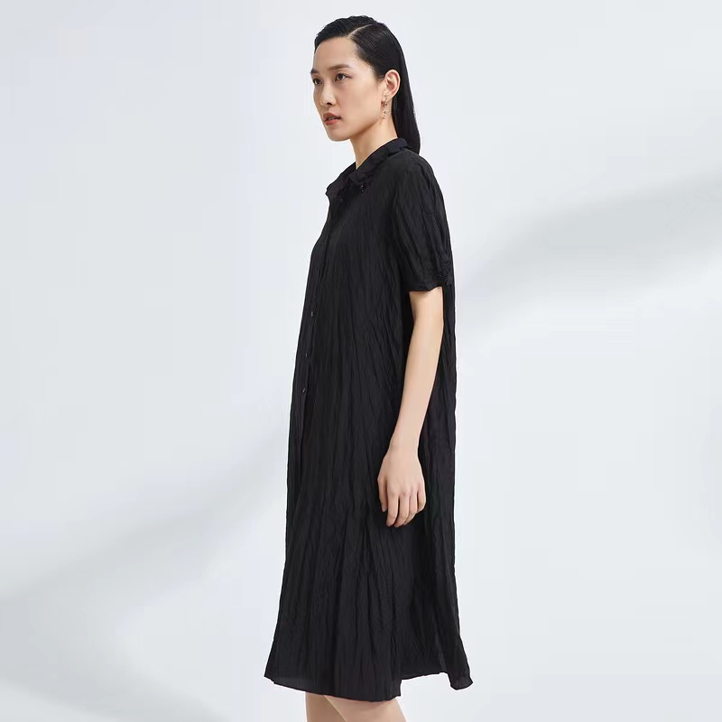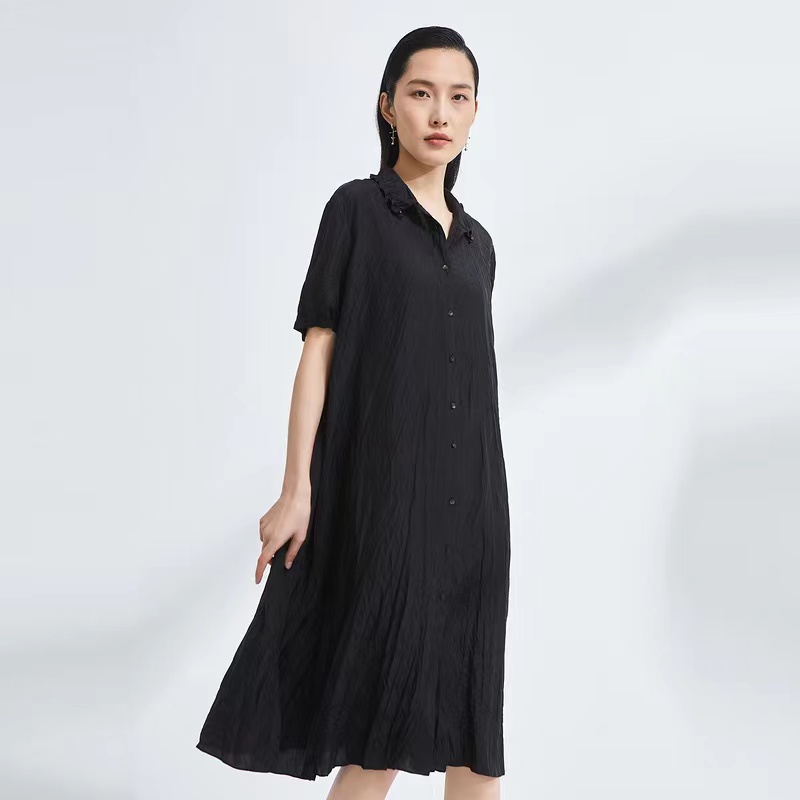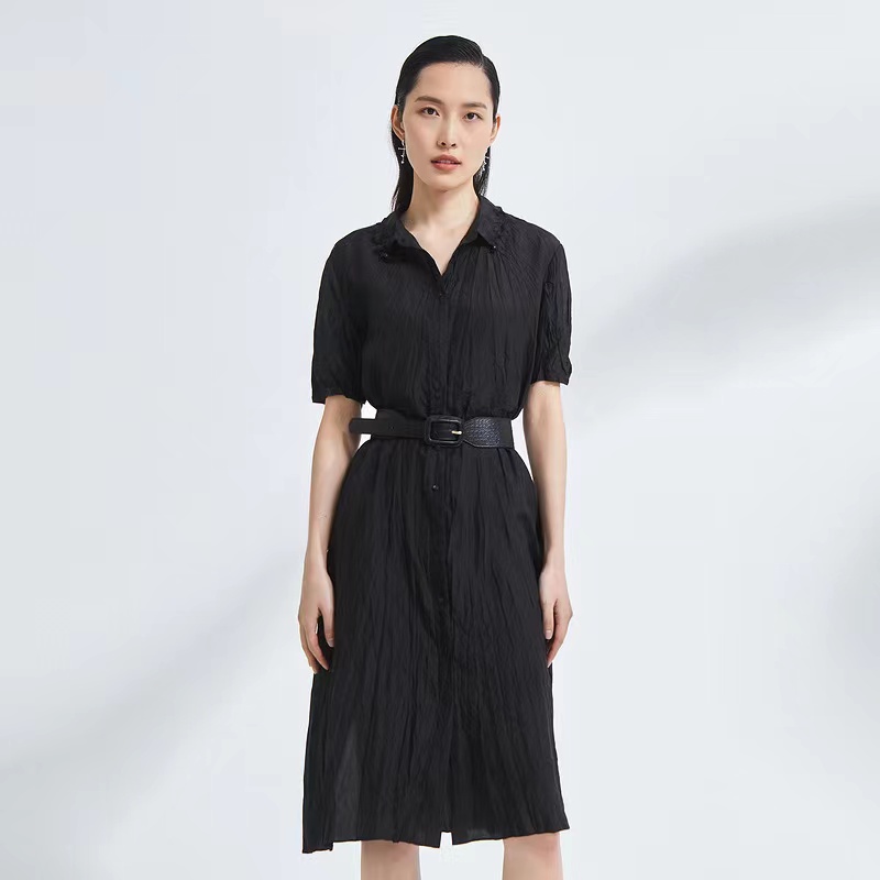 OTT服饰2021夏新品真丝压褶衬衫连衣裙