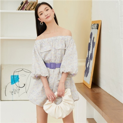 少女装>>Vero Moda2021春夏新款碎花一字领泡泡袖蓬蓬衬衫连衣裙女