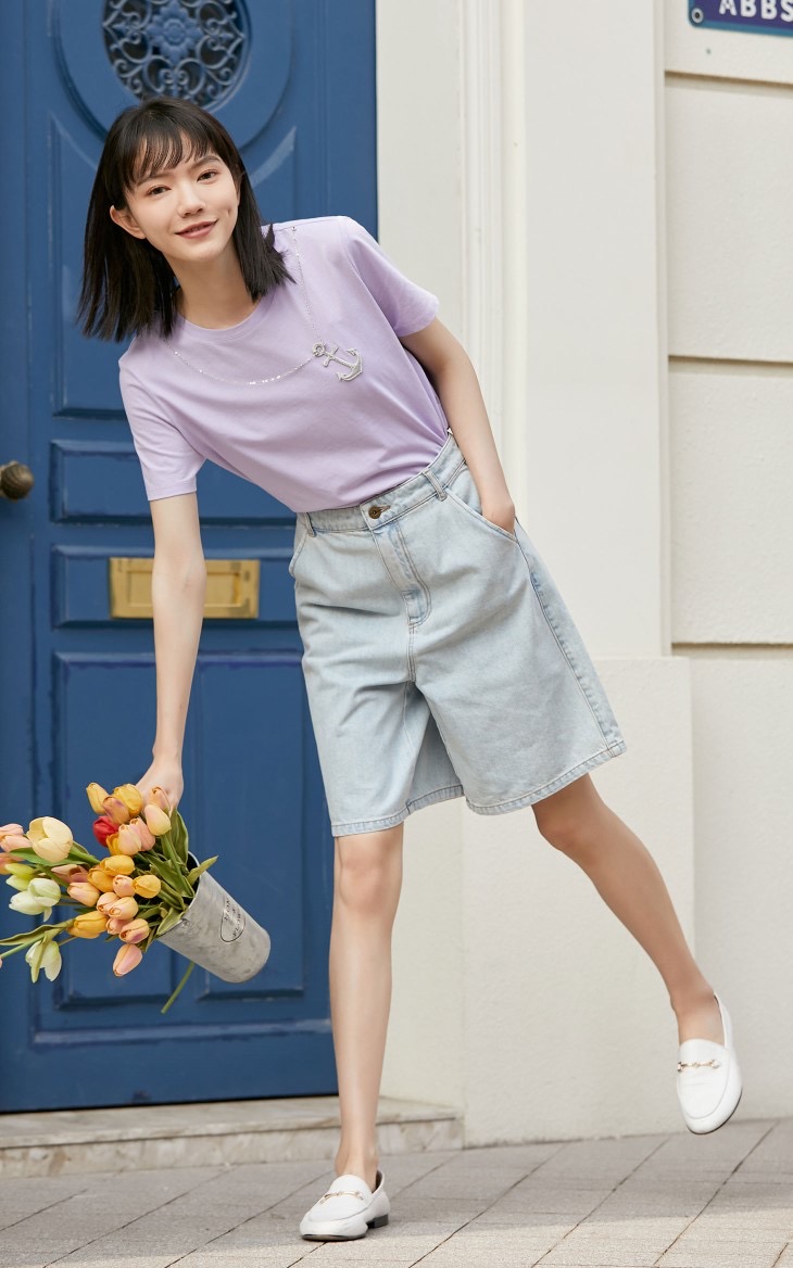 少女装>>VEROMODA2021夏装新款链条装饰航海风图案纯棉T恤